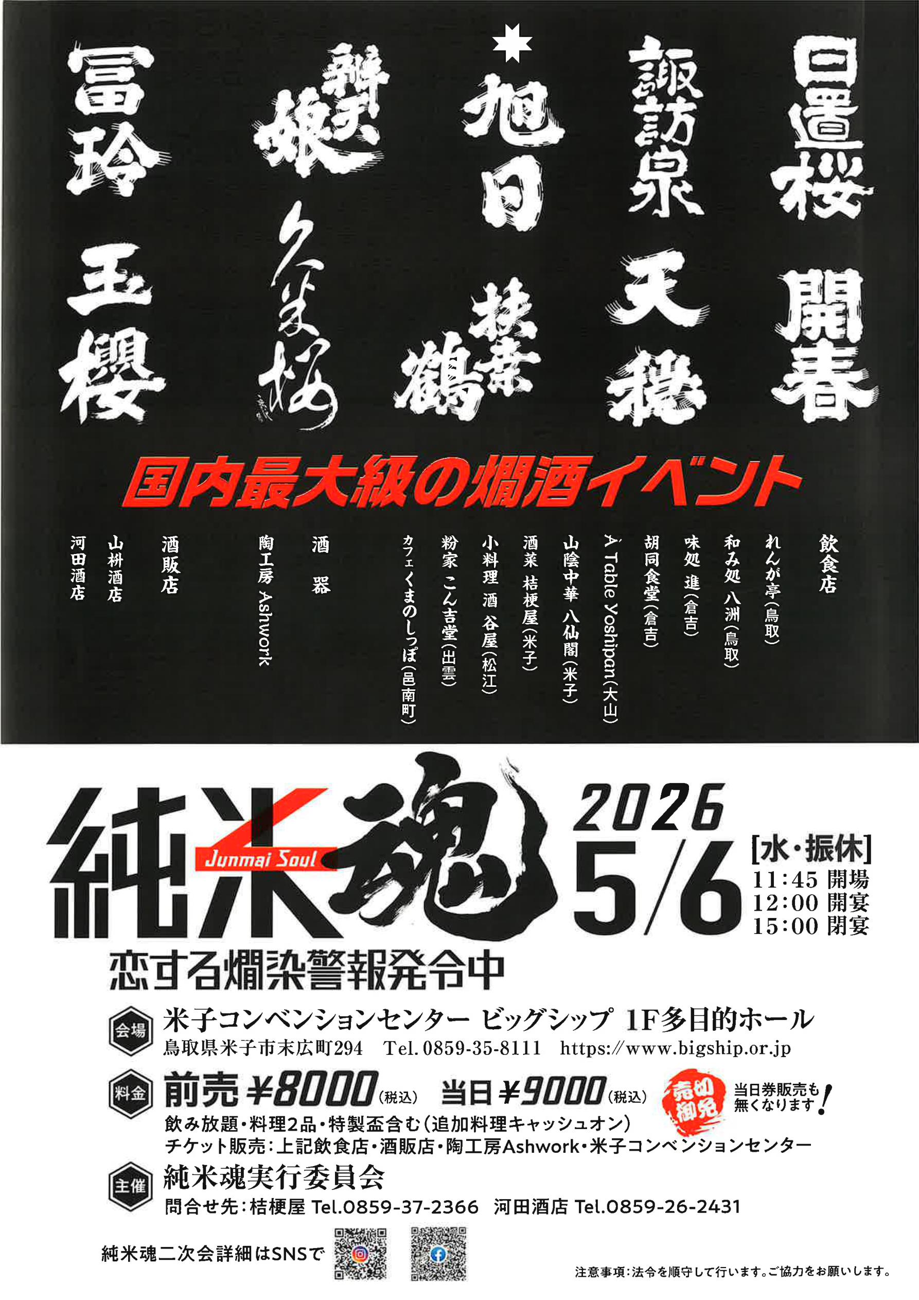 2026年 純米魂 米子 2026 3/30 開春便り 2026年3月30日 GW最終日の5月6日に米子コンベンションセンタービックシップ 1F 多目的ホールにて国内最大級の燗酒イベントに参加します!開春自慢の燗酒をご提供しますのでよろしくお願いします! 開春便り よかったらシェアしてね! URLをコピーしました! URLをコピーしました! 2026年 日本の酒メッセ 酒販店・飲食店・流通業向け大試飲会 ホワイトエール はるかなう この記事を書いた人 wakabakaisyun 関連記事 ホワイトエール はるかなう 2026年3月30日 2026年 日本の酒メッセ 酒販店・飲食店・流通業向け大試飲会 2026年3月28日 「温泉津佐間」発売のお知らせ 2025年6月11日